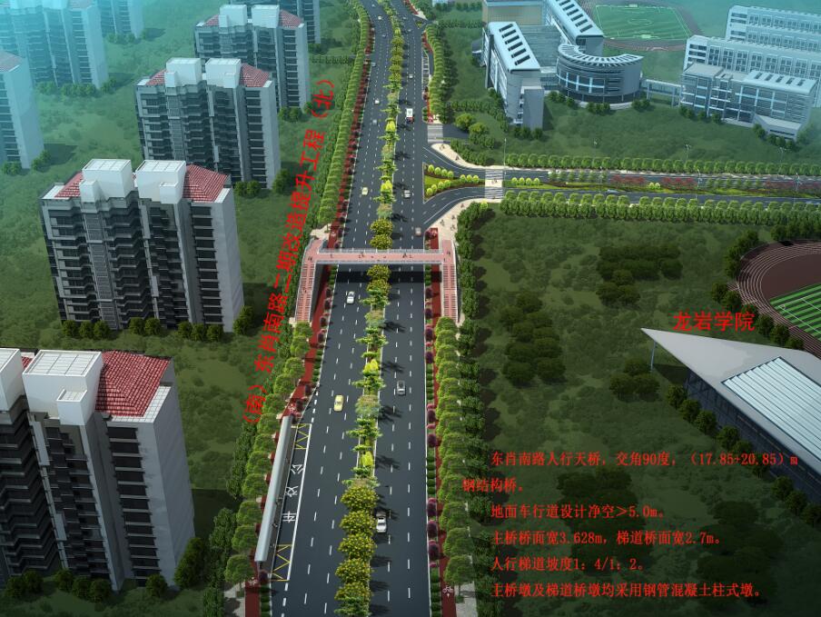 龍巖學院人行天橋位于龍巖學院大門北側(cè)約50米處,天橋采用“工”字形設(shè)計,橋面長40米、寬3.6米,兩側(cè)梯道坡度為1:4和1:2,跨度分別為17.85米和20.85米,寬2.7米,主橋墩及梯道橋墩均采用鋼管混凝土柱式墩,總投資約450萬元。